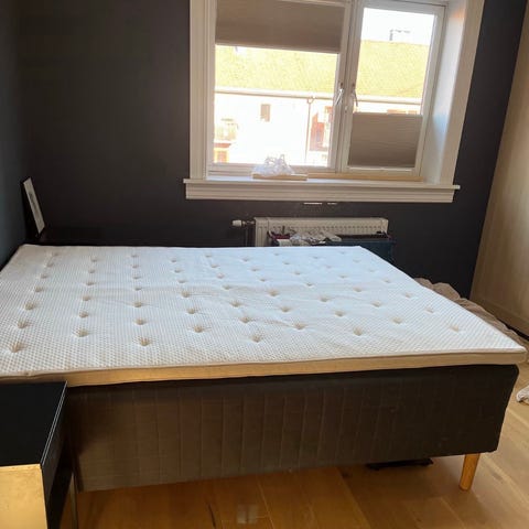 Jysk kontinentalseng i mørk grå tekstil. Sengen har treben i lyst treverk og overmadrass på toppen som er helt ny (bilde nr 4.) Kjøpt i 2023 men har blitt lite brukt da den har stått på et gjesterom og fremstår dersom som ny. Ingen flekker eller bruksmerker.