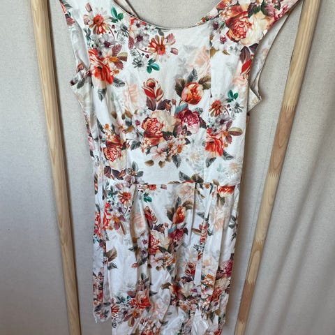 Sommerkjole i størrelse M for dame. Kjolen er flerfarget mønster med korte ermer og markert elastisk midje. Lengden går omtrent til kneerne , og skjørtet er vidt og utsvingt. Passer til bruk på varme dager, ferie eller andre anledninger. D&G lignende farge, italiensk style. Kjolen er godt brukt med ingen synlige skader eller noe.