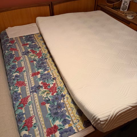 velholdt seng , antar det er fra ca 1920. Det er spesial bestilte Jensen madrasser og er kun blitt brukt som gjeste seng. Gis bort uten nattbord