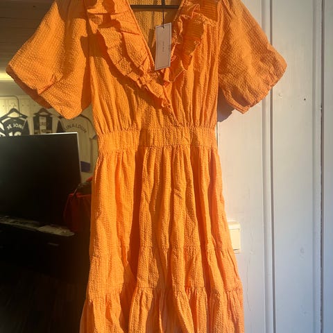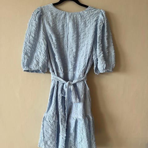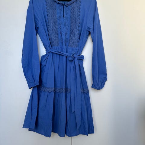 Neo Noir sommerkjole for dame i størrelse 34. Kjolen er i lys blå bomull og har omslagsoverdel med knyting i livet. Den har lange ermer med dekorative søm- og blondepartier, samt volangdetaljer i skjørtet. Materialet er lett og egnet for bruk i varmere vær. Passer som hverdags- og sommerkjole.