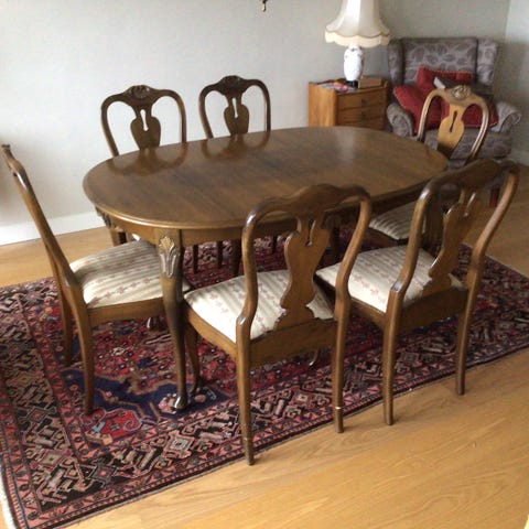 Plass: 6 stoler medfølger (stripete stofftrekk, hele og pene).