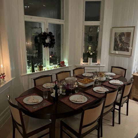 Vi selger vår pent brukte spisebord med 6 stoler, Perfekt for deg som trenger mye plass til en rimelig penge, eller for deg som ser potensialet i et male-prosjekt. Bordet kan forlenges.