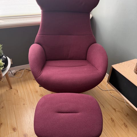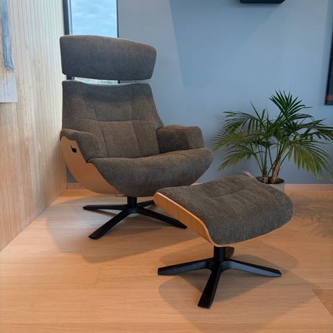 Selger en meget komfortabel Conform Timeout / Air lenestol med tilhørende pall i grått ullstoff. Dette er en kvalitetsstol med svært god ergonomi og sittekomfort – perfekt for avslapning, lesing eller TV-titting.