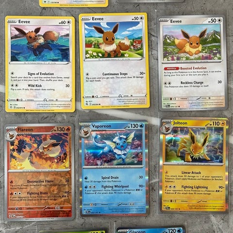 Samlingen på bildene består av flere Pokémon-kort med Eevee og ulike Eeveelutions-figurer. Kortene inkluderer blant annet Eevee, Umbreon, Espeon, Flareon, Leafeon, Jolteon, Glaceon og Sylveon. Noen av kortene har holo-/foil-effekt.