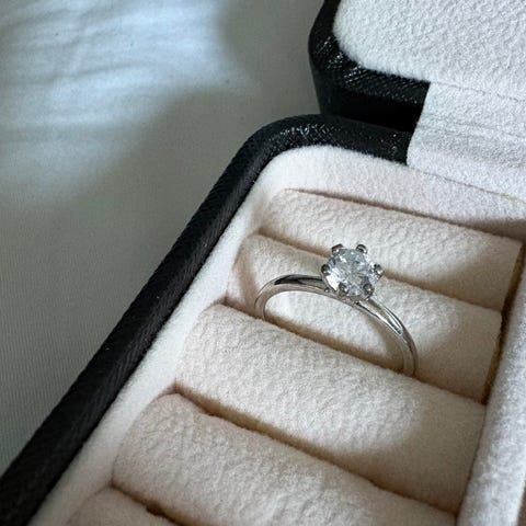 Ringen er i 14k hvitt gull, og diamanten er fra en av de høyeste farge kvalitetene