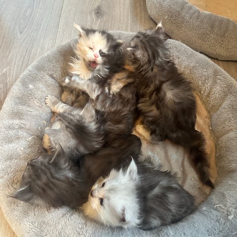 Vi har 5 nydelige og sosiale Maine Coon kattunger som søker kjærlige og trygge hjem. Kattungene vokser opp i et trygt og rolig hjemmemiljø sammen hvor de får mye kos, oppmerksomhet og daglig håndtering. De er godt vant til småbarn og vanlige hverdagslyder, noe som gjør dem trygge, sosiale og godt tilpasset familieliv. Maine Coon er en fantastisk familievennlig rase, ofte kalt «Gentle Giants».