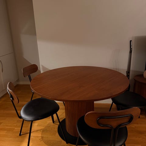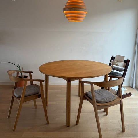 Rundt spisebord fra Bohus kjøpt nytt av oss. Noen bruksmerker må regnes med men kan ikke se noen tydelige bruksmerker utenom 1 tydelig hakk i den ene ileggsplaten (ref siste bilde). Følger med 2 ileggsplater.