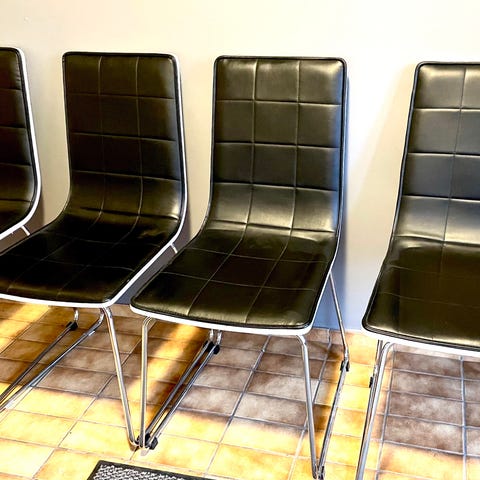 4 stykk selges. Lett å vedlikeholde og vaske, svart skinn i helt fin tilstand. Bein i valnøtt farge.