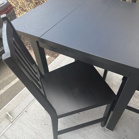En av stolene har et bein som er litt løs, de andre krever at forbeina strammes en gang i blant, da skruene blir litt slakke etterhvert.