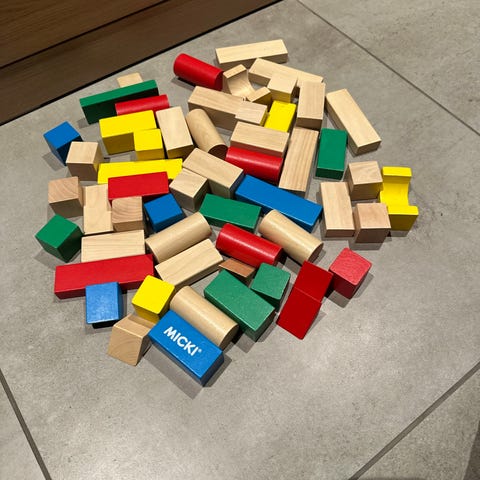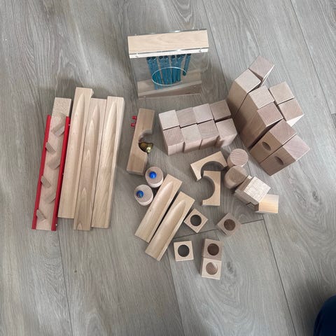 Kapla byggeklosser treleker i lyst tre. Settet består av rektangulære treklosser i ulike lengder, levert i en trekasse med utskårne håndtak på sidene. Klossene kan brukes til bygging og konstruksjon, og egner seg som klassisk treleke for barn. Materialet er ubehandlet eller lett behandlet treverk som gir et naturlig uttrykk.