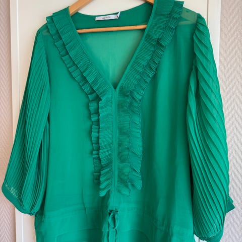 Ny FREEQUENT bluse for dame i størrelse XXL. Blusen er grønn og laget i polyester. Modellen har korte ermer og rund hals. Detaljert blondeparti øverst på skuldre og øvre rygg. Rett fasong og lengde ned over hofter. Passer som topp til hverdagsbruk eller mer pyntede anledninger. Tilsalgs kr 100,-.