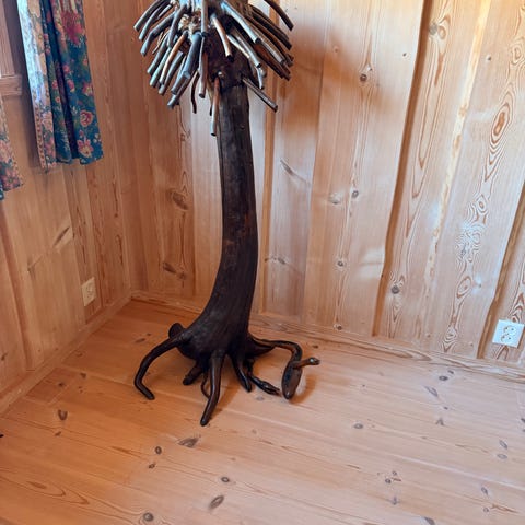 Håndlaget vinreol i tre, laget av grov drivved . Reolen er utformet som en vertikal søyle med utskårne hyller og utsparinger til vinflasker. Naturmaterialet gir et rustikt uttrykk, og ujevn struktur i treverket gjør hver reol unik. Egnet til oppbevaring og presentasjon av vinflasker i hjem, hytte eller vinkjeller.