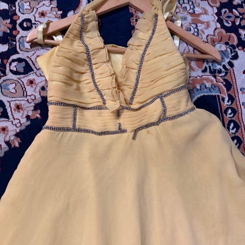 kjole til spesiell anledning i gull, one size. Kjolen er laget i polyester og har et langt, rett snitt. Overdelen er ermeløs med rund hals, og kjolen har dekorative detaljer og mønster foran og bak. Nederst har den et lett, fallende skjørt. Passer til formelle anledninger som selskap, bryllup eller andre spesielle begivenheter.