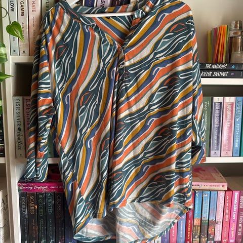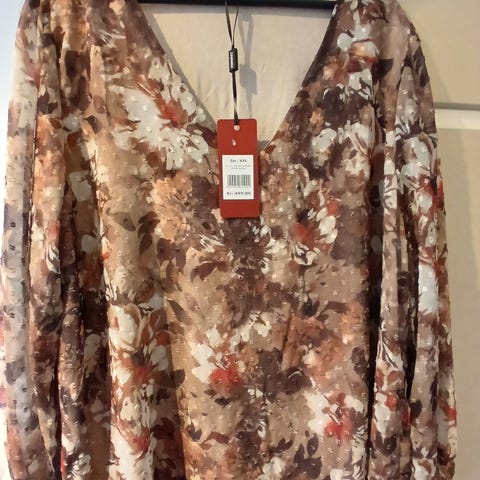 Zavanna Olympia bluse i størrelse XXL for dame. Blusen er flerfarget med mønster i blant annet brun-, oransje- og grønntoner. Materialet er 100 % viskose. Modellen har korte, vide ermer med rynkedetaljer og en løs, rett passform. Passer til hverdagsbruk eller enklere penere anledninger, og kan kombineres med både bukser og skjørt.