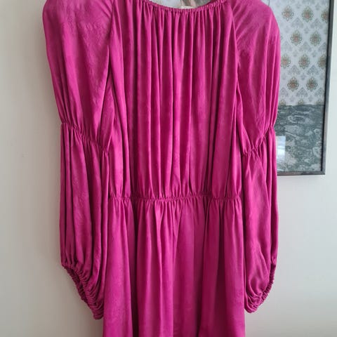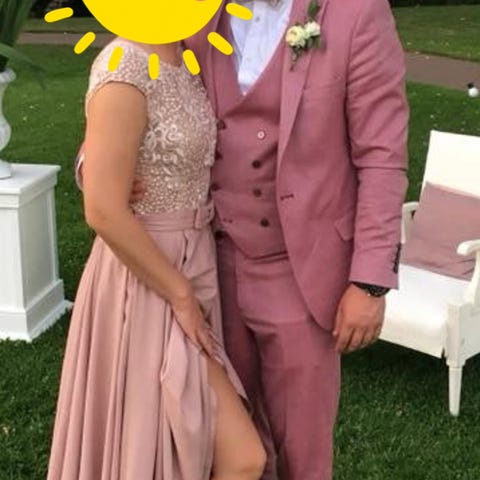 kjole til spesiell anledning i størrelse M. Kjolen er laget i chiffon og har en rosa, fotsid skjørtedel. Overdelen har halterneck-snitt med dekorative perler og broderier, samt innsvinget midje. Passer til formelle anledninger som fest, bryllup eller ball.