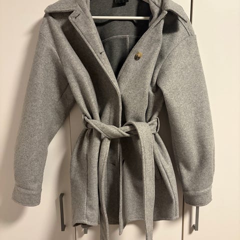 Grå kåpe, Amisu jakke, kåpe med hette, New Yorker kåpe, damekåpe, belte i livet, dobbeltspent kåpe. Str S, str 36