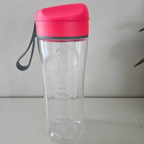 Tupperware drikkeflaske i rosa plast med trykk av katt, skyer og hjerter. Flasken har skrulokk med drikkeåpning i matchende rosa farge. Egnet til kald drikke og praktisk til bruk i hverdagen, på skole, jobb eller fritidsaktiviteter.