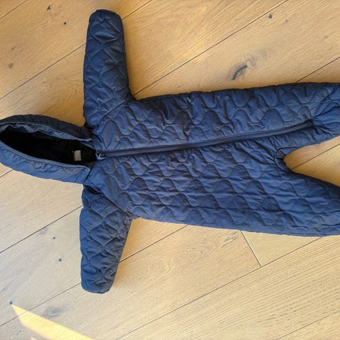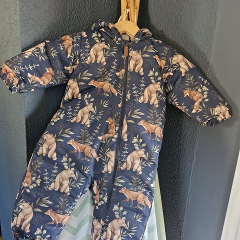 Newbie vinterdress for barn i størrelse 80. Kjeledressen er blå og laget i polyester. Modellen er unisex og har hette med mykt, loddent fôr på innsiden. Den har glidelås foran for enkel av- og påkledning. Strikk nederst ved bena med hemper som kan festes under sko eller sokker for å holde bena på plass. Egnet som ytterdress til små barn i kjøligere vær.