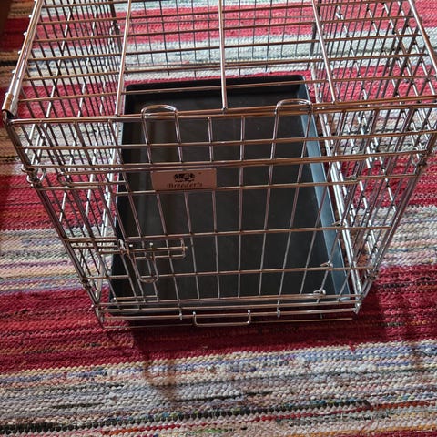 Sammenleggbar hundebur i tekstil i grønn farge med sorte detaljer. Buret har nettingåpninger på flere sider for lufting og innsyn, samt stoffluker som kan rulles opp eller lukkes. Det kan foldes flatt for enkel lagring og transport. Egnet som midlertidig ligge- og hvileplass for hund, for eksempel hjemme, på reise eller på trening.