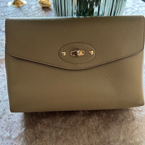 Mulberry clutch for dame i semsket skinn. Vesken har håndleddsrem og lukkes med klaff og glidelås. Innvendig er det et hovedrom og en glidelåslomme for oppbevaring av mindre eiendeler. Metallplate med Mulberry-logo på utsiden gir et karakteristisk uttrykk. Passer til bruk som liten veske eller lommebok ved ulike anledninger.