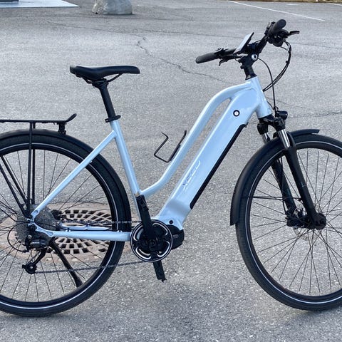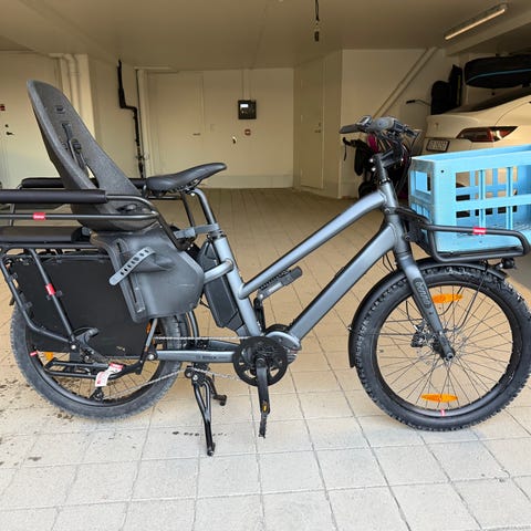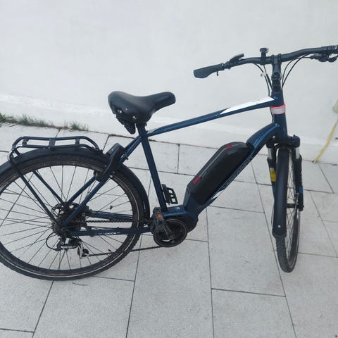 8 gir, rød med bagasjeholder bak og korg foran. Piggdekk lite brukt på , sommerdekk følger med. Ca 85 km rekkevidde når fulladet. Nypris i 2022 : kr 20000.