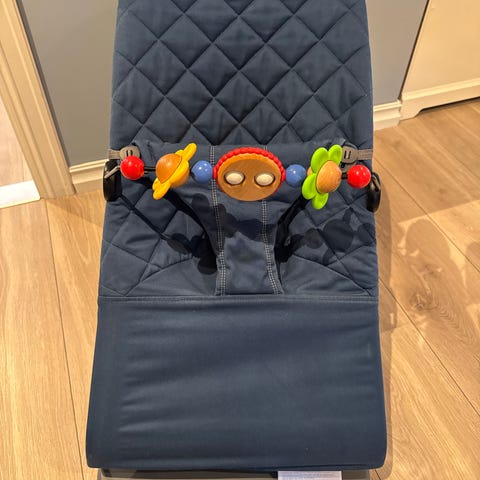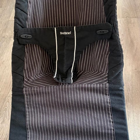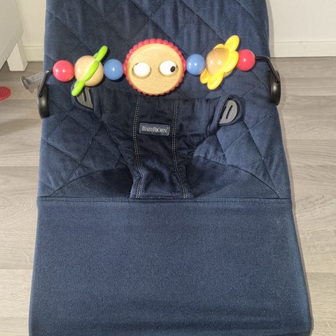 Stolen er godt brukt, men fungerer helt fint. Trekket er marineblått og noe solbleket, så fargen er litt lysere enkelte steder. Ellers normal bruksslitasje. Trekket kan tas av og vaskes.