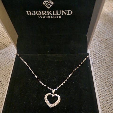 Pent hjerte halskjede fra Bjørklund. Stemplet 925 (Sterling sølv). Gullfarget/forgylt. Lite brukt og i god stand. Selges med original eske.