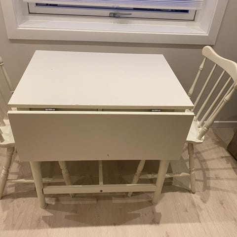 Praktisk lite spisebord i tre med ilegg/uttrekk slik at bordet kan gjøres større ved behov. Perfekt til liten leilighet, kjøkken eller hybel.