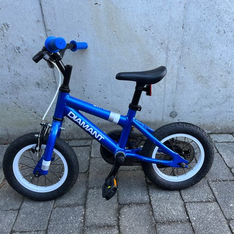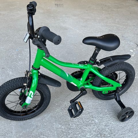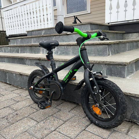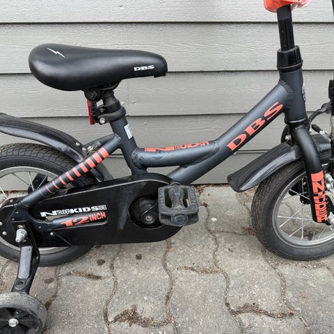 MERIDA Barnesykkel 12" i svart og rød farge. Sykkelen har støttehjul, kjedekasse, skjermer og fotbremse bak kombinert med håndbrems foran. Passer for mindre barn som skal lære å sykle på en stabil sykkel med små hjul og lav innstegshøyde.