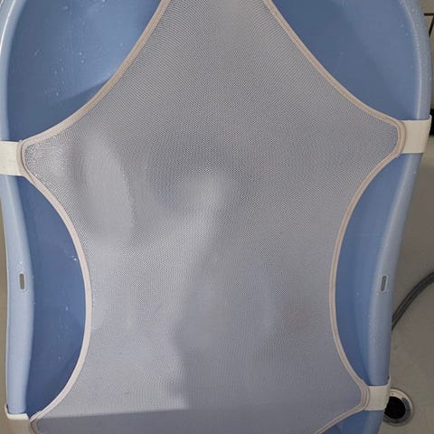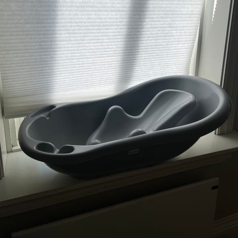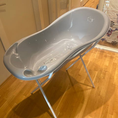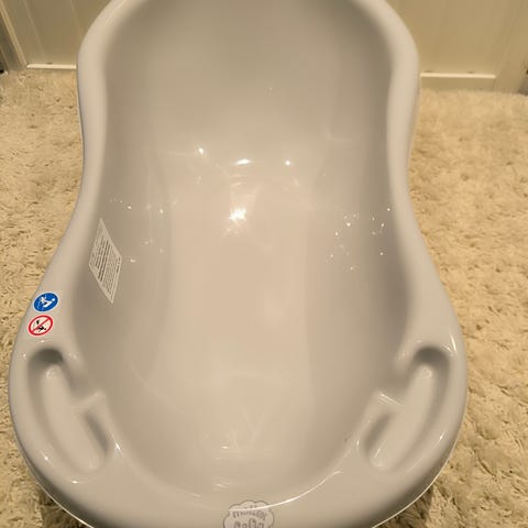 Hvit babybadekar i plast med innebygd temperaturindikator i bunnen. Badekaret har ergonomisk form med opphøyde kanter for støtte, og er egnet for bading av spedbarn og små barn. Temperaturindikatoren viser om vannet er kaldt, optimalt eller varmt ved hjelp av fargemarkeringer og symboler.