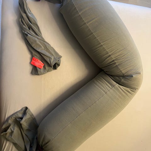 Bbhugme gravidpute i grønn farge. Kjøpt ny august 2025 for 1399. Ble brukt i 2. og litt i 3 trimester. Et par flekker som er kommet gjennom trekket på puten, men det er ikke veldig synlig. Puten har sin fortsatt sin fasthet. Trekket er vasket.