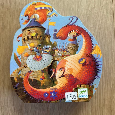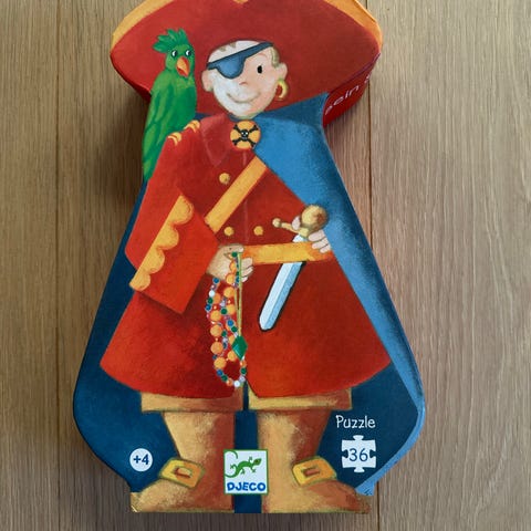 Djeco piratskip puslespill med 54 brikker. Motiv av piratskip med mange detaljer og figurer. Leveres i formet eske som også kan brukes til oppbevaring av puslespillet. Egnet som aktivitet for barn som liker pirater og fargerike motiver.