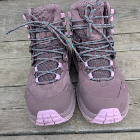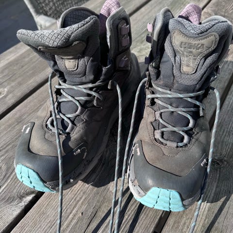 Hoka One One W KAHA 2 GTX tursko i størrelse 40 2/3. Høye tursko med snøring og kraftig yttersåle med grovt mønster, egnet for fottur. Skoene er i grå farge med detaljer i turkis og mørke toner. Overdelen er i syntetisk materiale og tekstil med polstret ankelparti for støtte. Vibram-yttersåle gir godt grep på variert underlag. Passer til fotturer og annen bruk utendørs. Brukt en gang. Veldig gode sko men dessverre er de litt for små for meg.