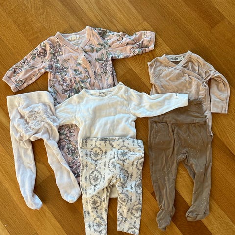4 bodyer og 1 bukse i str 74. Vårlige fine farger til jente. Merkene er hust & clare, nameit og newbie.