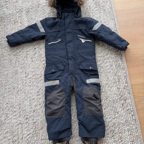 Didriksons vinterdress med refleks. Sterk farge som er lett å spotte. Borrelåser og glidelåser fungerer som de skal. Trenger nye fotstrikker, knapper sitter på. Et lite begynnende hull i rumpa, og et på det ene kneet. Disse kan lett fikses med reparasjonstape. Har normale bruksmerker, men masse bruk igjen! Denne dressen har vi vært veldig fornøyd med! Str 100 cm.
