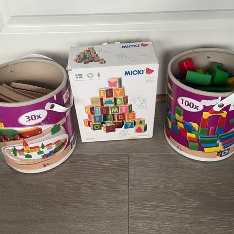 Hape byggeklosser treklosser i ulike farger. Settet består av flere geometriske former i tre, malt i forskjellige sterke farger. Klossene kan brukes til å bygge tårn, hus og andre konstruksjoner, og egner seg til lek, bygging og enkel øving på form- og fargegjenkjenning for barn.