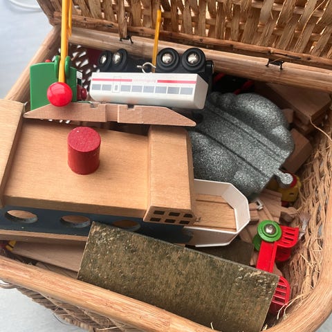 BRIO bro til togbane i rød plast med skinnepartier i tre. Broen er utformet som en hengebro og kan kobles til andre BRIO-togbaneskinner med standard BRIO-koblinger i tre. Egnet som tilleggsdel til BRIO togbane og lignende tretogsystemer for barn.