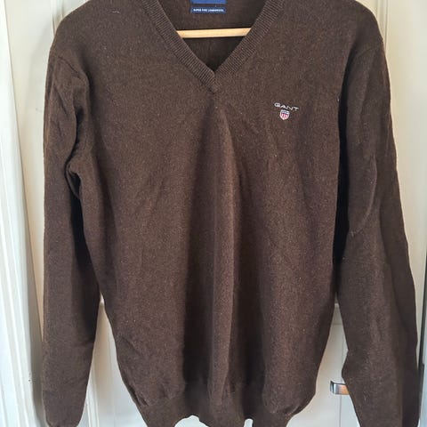 Gant genser for herre i størrelse L. Genseren er brun og laget av ull. Den har lange ermer og V-hals, med ribbestrikkede kanter nederst og på ermene. Passer til hverdagsbruk og som et ekstra lag på kjølige dager.