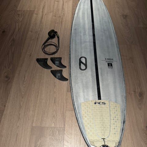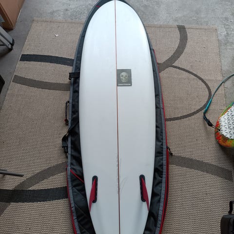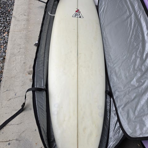 Surfebrett fra Australia. Brettet har flere finnebokser og leveres med monterte finner. Designet er merket «Designed by Murray Bourton». Medfølgende polstret trekk beskytter brettet under lagring og transport. Ødelagt glidelås. Egnet til bølgesurfing. Jeg har ikke surfet med det.
