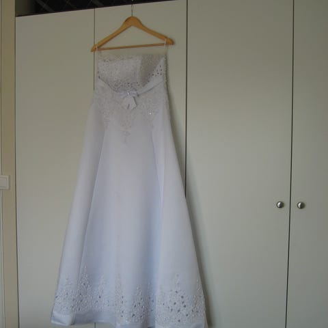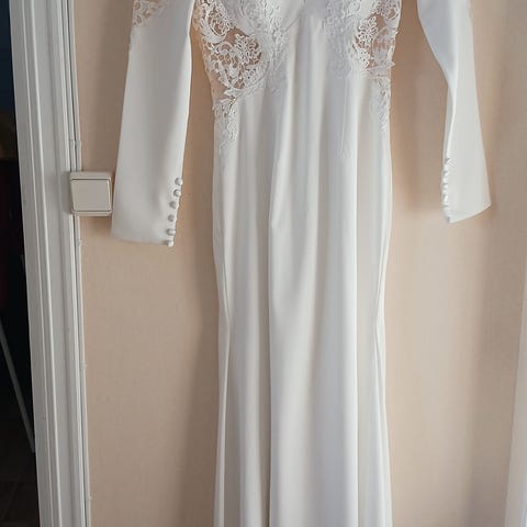 Anewsta kjole for dame i størrelse L (EU 40/42). Kjolen er hvit og laget av polyester. Den har kort pufferm, høy hals og dekorative knapper foran. Skjørtet er middels langt med lett vidde. Stoffet har broderte eller vevde blomsterdetaljer. Glidelås i ryggen og knytebelte i livet. Egnet til bruk ved formelle anledninger eller andre høytidelige sammenhenger.