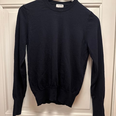 Filippa K genser i 100% merinoull. Rund hals og noe kort i lengden, veldig fin til skjørt eller sammen med dressbukse. Fargen er en slags «greige» - men mer beige enn grå.