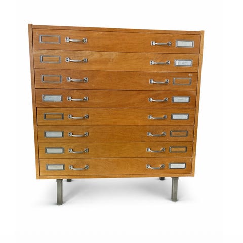 Et funksjonelt oppbevaringsmøbel med tydelig historisk identitet, egnet for verksted, studio, butikk eller moderne interiør.