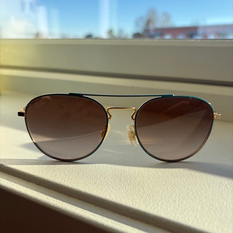 Elegant modell i gullfarget metall med mørk blå detaljer og speilglass.