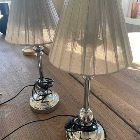 2 stk Scan Gifts bordlamper med hvit glasskjerm og svart metallfot. Lampene har dekorativ, buet lampefot i metall og rund base. Glasskjermen er matt/hvit og gir et mykt, diffust lys. Typen er merket PQ1201RS, 230 V, maks 60 W. Egnet som bordlampe på nattbord, skrivebord eller sidebord i stue eller soverom.