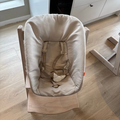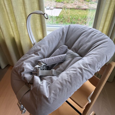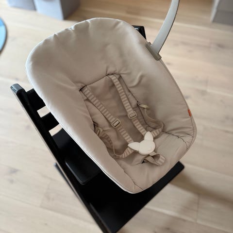 Stokke Tripp Trapp Newborn Set: Nyfødtsete til Tripp Trapp barnestol med sele og «stang» til å henge en leke på. Trekket på stolputen er lys grått, nyvasket og uten slitasje eller andre bruksmerker.