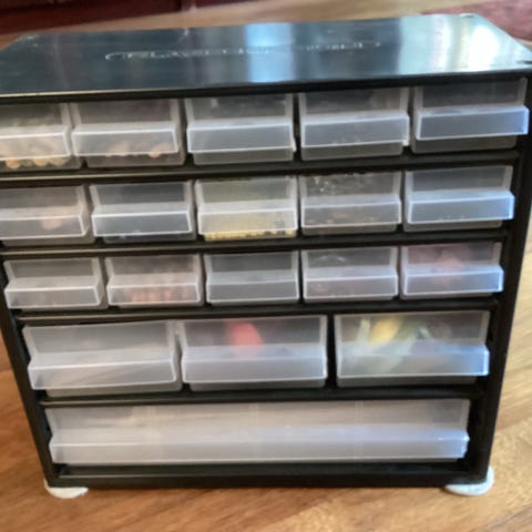 Oppbevaring av hobbyting med enkel tilgang, boksene stables i høyden. Kjøpt på Søstrene Grene, hardt resirkulert plastmateriale, fersken og lyseblå farger. Selges kr 50 pr stk eller alle for 150. Valgfri sending.