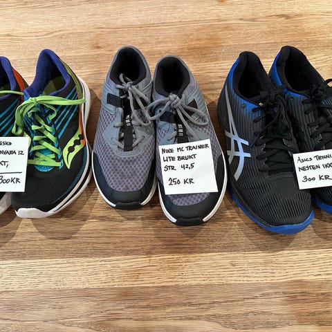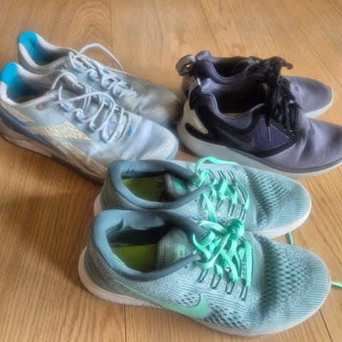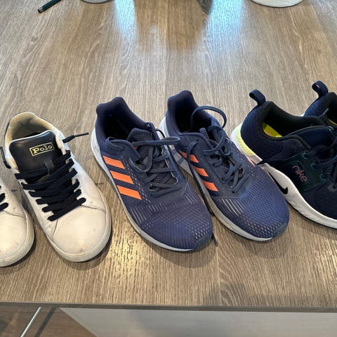 Adidas og Nike treningssko i størrelse 37 (står 36,5 og 38, men begge tilsvarer 37). Har brukt begge til både jogging og lett innetrening. Verdens beste «sokkesko» som er veldig behagelige å trene i!