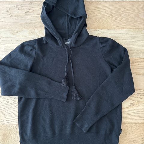 ella&il hettegenser for dame i størrelse XS. Genseren er i grå ull med hette og knyting i halsen. Myk, lodden struktur og lange ermer. Passer til hverdagsbruk og kan kombineres med både bukser og skjørt.