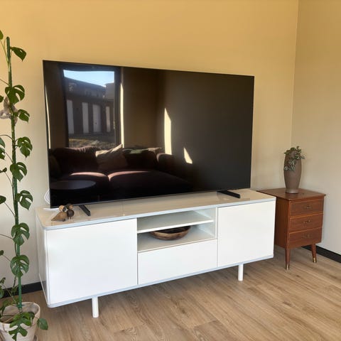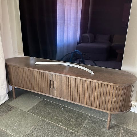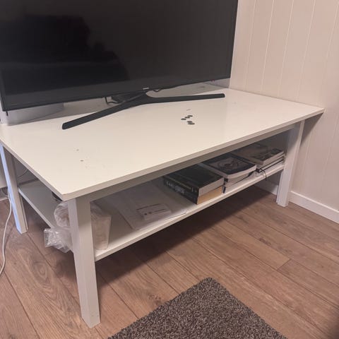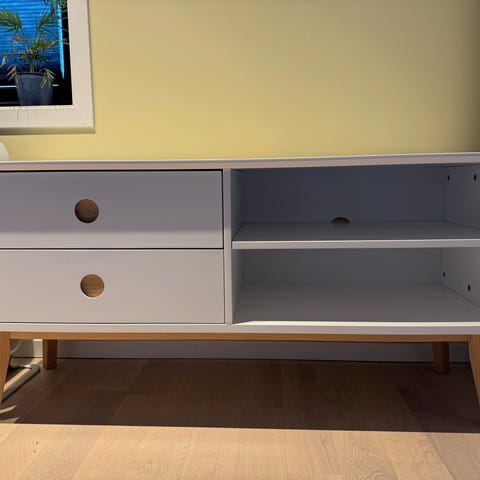 TV-benk i hvitolja eikefiner med hvite fronter fra Bohus. Møbelet har åpne hyller, et skap med dør og innvendig hylle, samt to skuffer. Egnet for plassering av TV, medieutstyr, spillkonsoller, bøker og annet tilbehør. Overflaten på toppen gir plass til TV og dekor, mens hyller og skuffer gir lukket og åpen oppbevaring. Mål 152x42 cm. Høyde 55 cm. Selges grunnet flytting. Pris kan diskuteres ved rask avgjørelse.