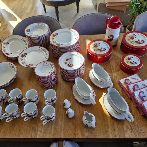 Modern House servisesett med julemotiv. Settet består av to serveringsfat og to boller, samt et sausnebb, åtte flate og åtte dype tallerkener.